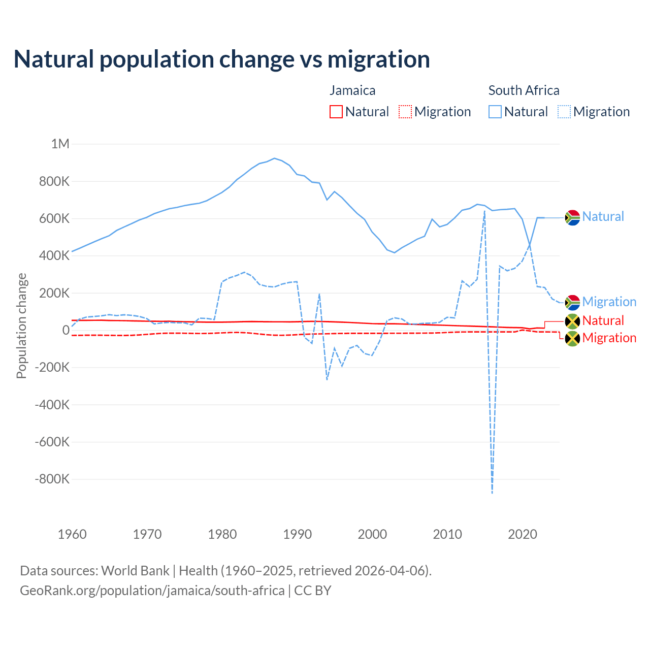 Over the last 10 years, 61.3% of the population change in Jamaica is from natural causes (a gain of 137,465 people) and 38.7% is from migration (a loss of 86,681 people). In South Africa 72.8% is from natural causes (a gain of 6,190,027 people) and 27.2% is from migration (a gain of 2,316,795 people).