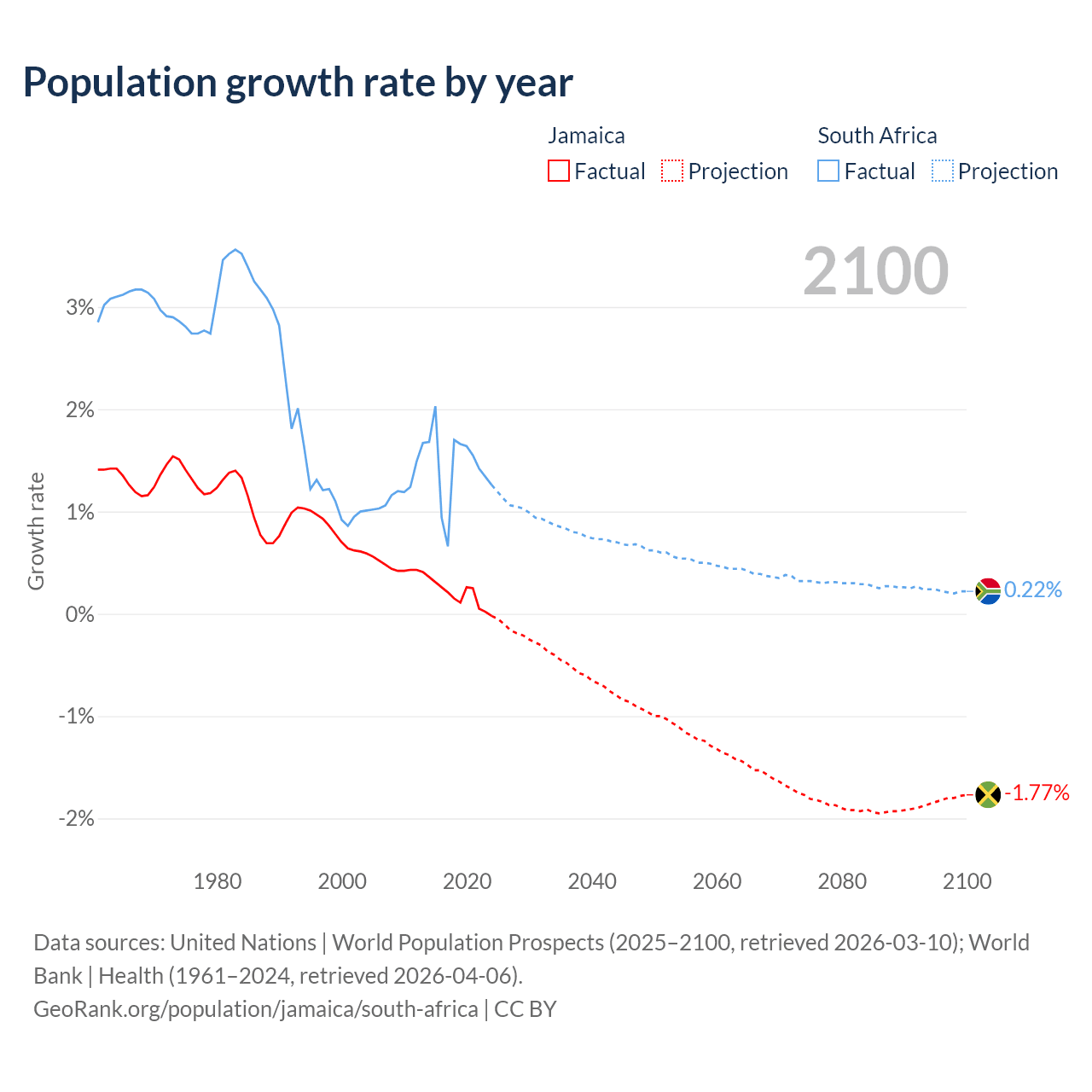 - For the last 10 years, Jamaica has had an average growth rate of +0.18% per year vs +1.44% in South Africa.