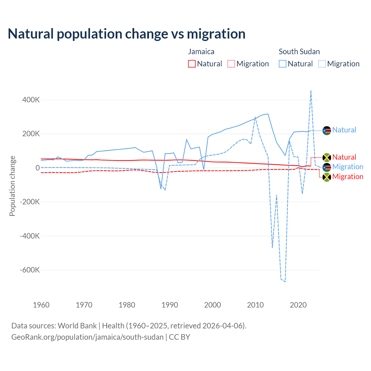 Over the last 10 years, 61.3% of the population change in Jamaica is from natural causes (a gain of 137,465 people) and 38.7% is from migration (a loss of 86,681 people). In South Sudan 57.4% is from natural causes (a gain of 1,792,135 people) and 42.6% is from migration (a loss of 1,329,606 people).