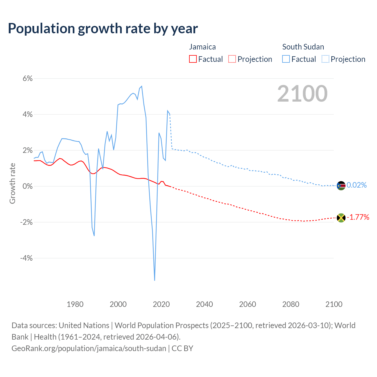 - For the last 10 years, Jamaica has had an average growth rate of +0.18% per year vs +0.65% in South Sudan.