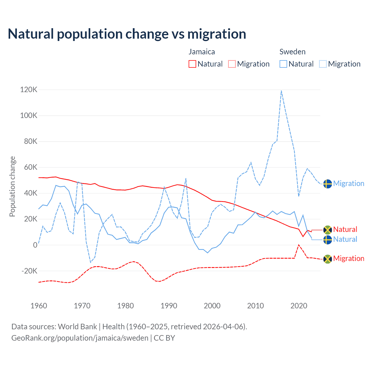 Over the last 10 years, 61.3% of the population change in Jamaica is from natural causes (a gain of 137,465 people) and 38.7% is from migration (a loss of 86,681 people). In Sweden 21.4% is from natural causes (a gain of 201,900 people) and 78.6% is from migration (a gain of 743,642 people).