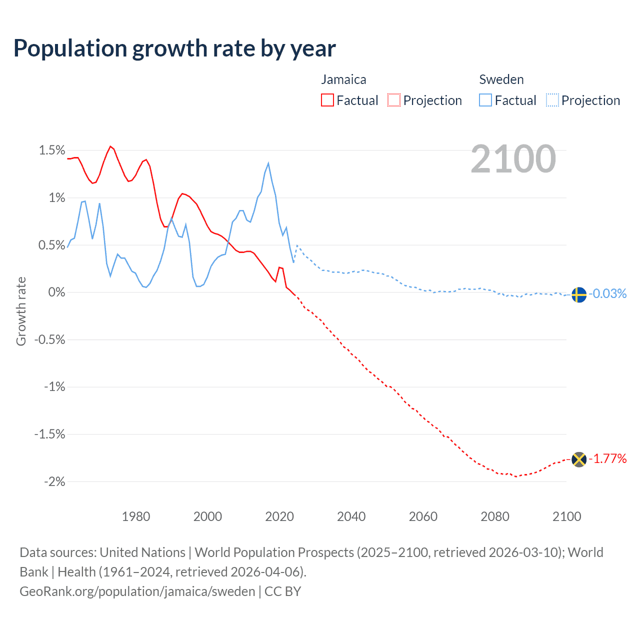 - For the last 10 years, Jamaica has had an average growth rate of +0.18% per year vs +0.88% in Sweden.