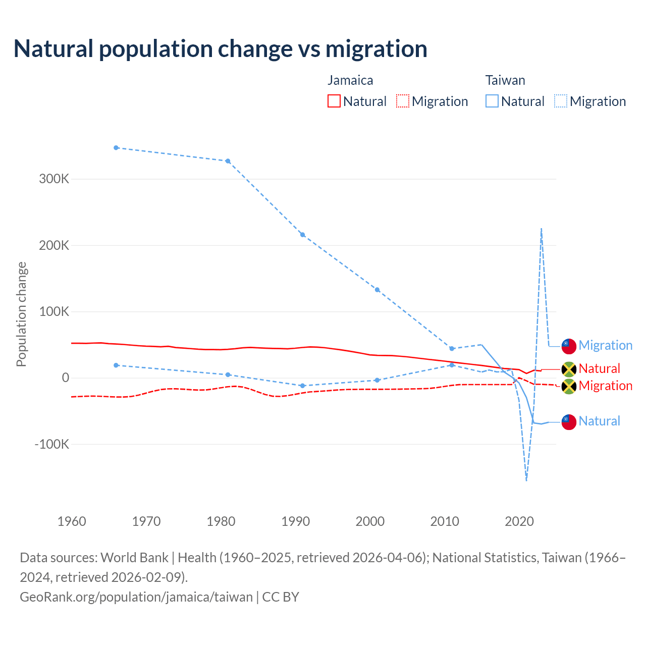 Over the last 10 years, 61.3% of the population change in Jamaica is from natural causes (a gain of 137,465 people) and 38.7% is from migration (a loss of 86,681 people). In Taiwan 56.7% is from natural causes (a loss of 57,467 people) and 43.3% is from migration (a gain of 43,884 people).
