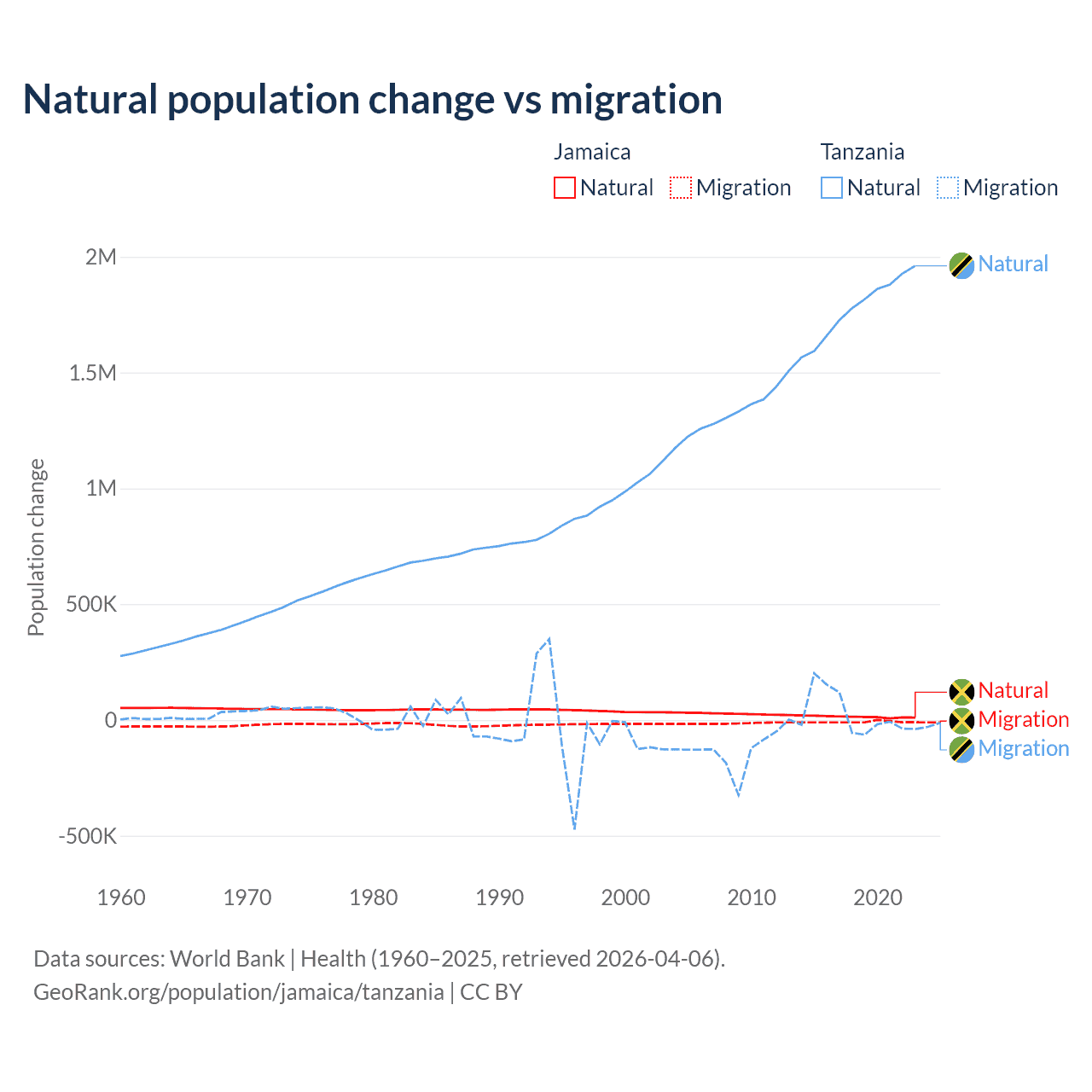 Over the last 10 years, 61.3% of the population change in Jamaica is from natural causes (a gain of 137,465 people) and 38.7% is from migration (a loss of 86,681 people). In Tanzania 98.7% is from natural causes (a gain of 17,769,541 people) and 1.27% is from migration (a gain of 229,466 people).