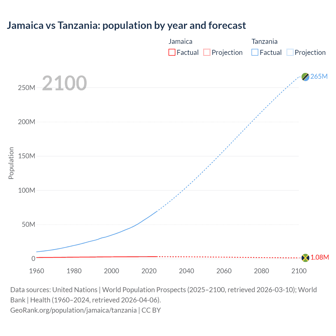 The latest officially reported population of Jamaica was 2,839,175 in 2024 vs 68,560,157 people in Tanzania in 2024. In 2026, based on the adjusted UN estimation, the current Jamaica's population is 2,834,980 people compared to 73,145,892 in Tanzania.