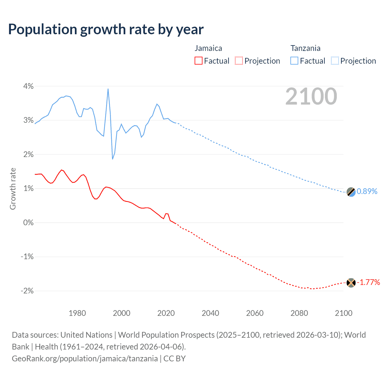 - For the last 10 years, Jamaica has had an average growth rate of +0.18% per year vs +3.13% in Tanzania.