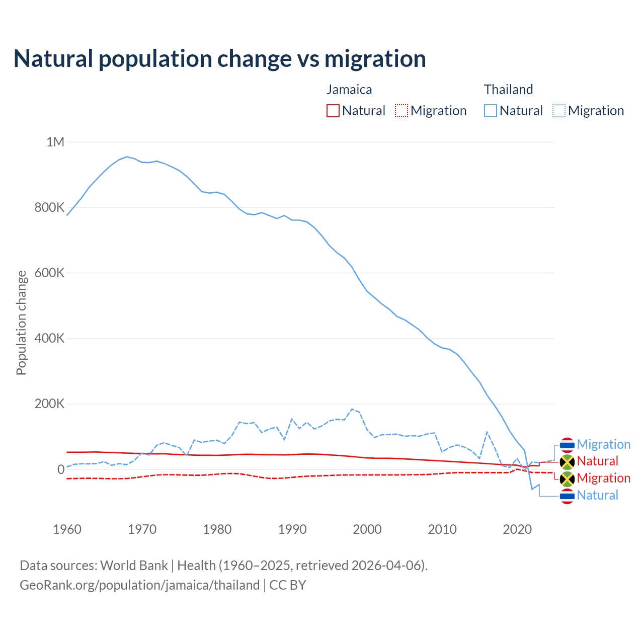 Over the last 10 years, 61.3% of the population change in Jamaica is from natural causes (a gain of 137,465 people) and 38.7% is from migration (a loss of 86,681 people). In Thailand 78.4% is from natural causes (a gain of 1,292,528 people) and 21.6% is from migration (a gain of 355,361 people).