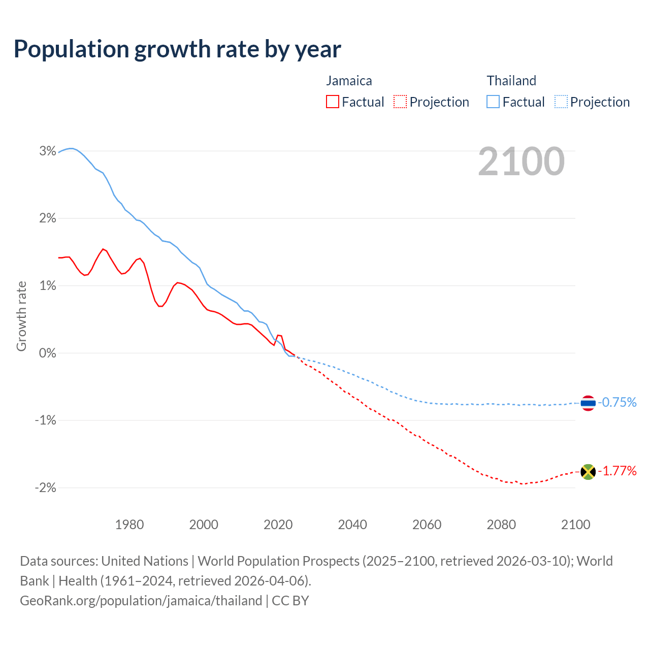 - For the last 10 years, Jamaica has had an average growth rate of +0.18% per year vs +0.23% in Thailand.