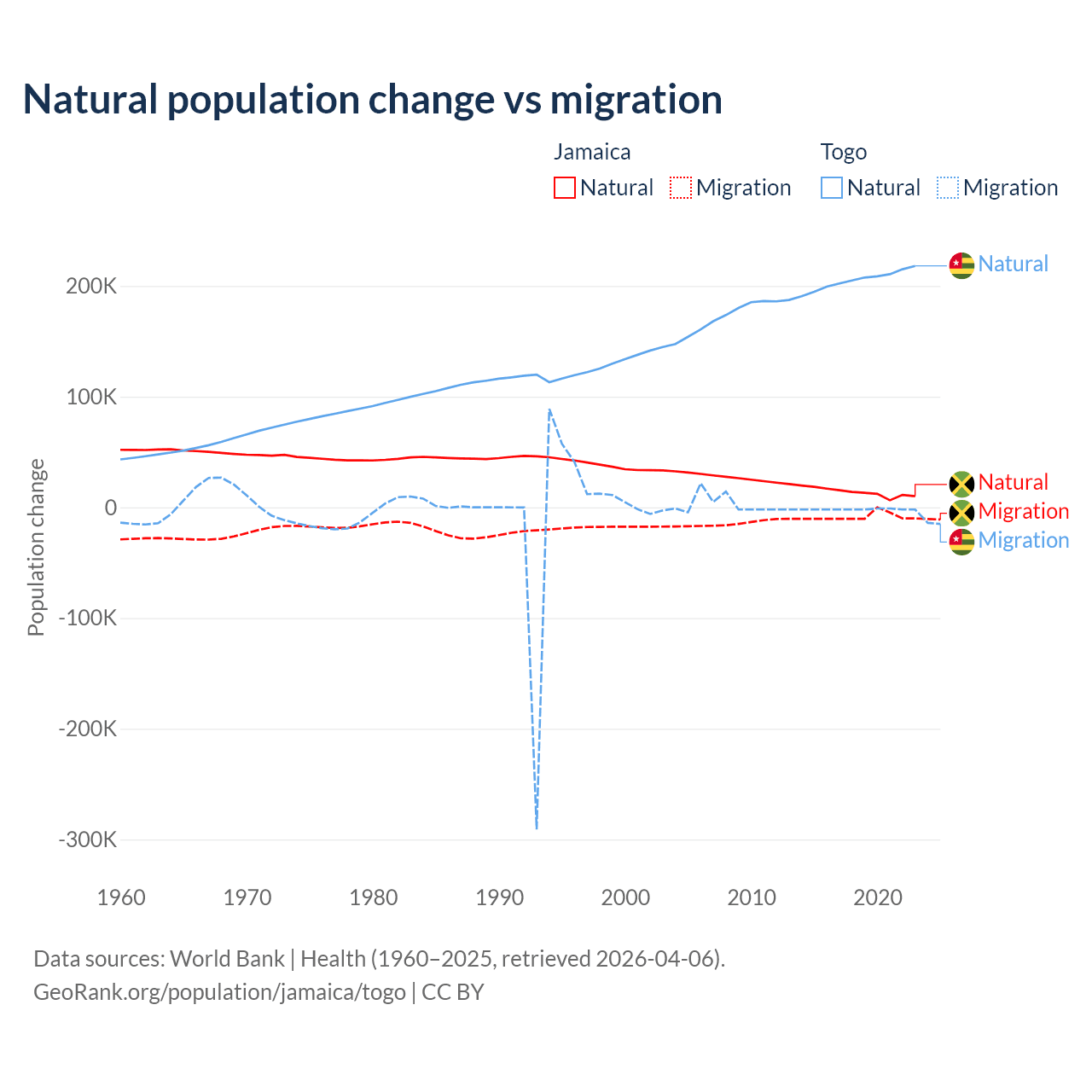 Over the last 10 years, 61.3% of the population change in Jamaica is from natural causes (a gain of 137,465 people) and 38.7% is from migration (a loss of 86,681 people). In Togo 99.1% is from natural causes (a gain of 2,052,115 people) and 0.86% is from migration (a loss of 17,852 people).