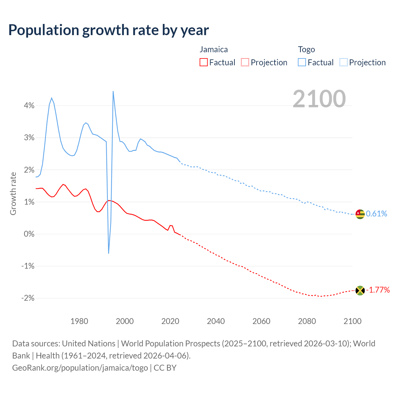 - For the last 10 years, Jamaica has had an average growth rate of +0.18% per year vs +2.46% in Togo.