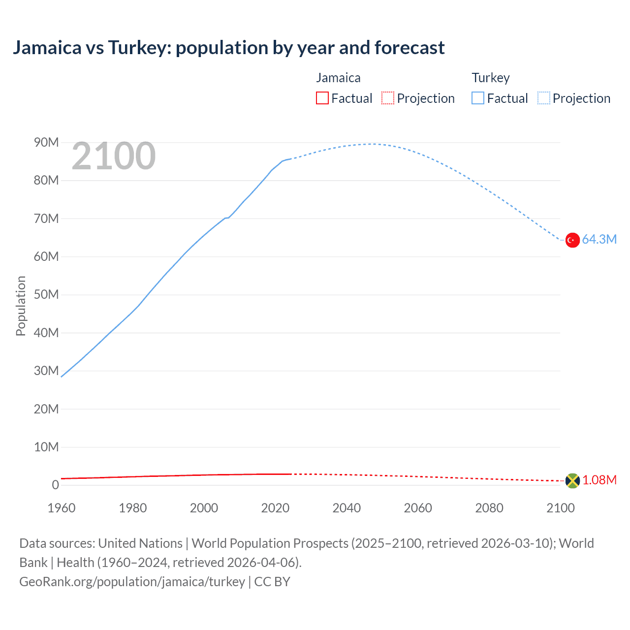 Jamaica vs Turkey: population by year and forecast