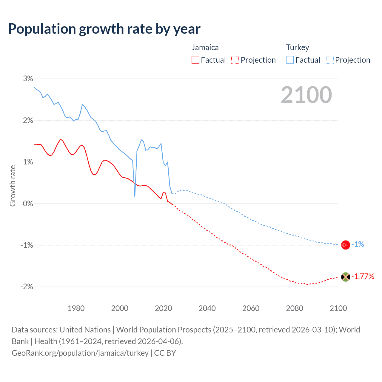 - For the last 10 years, Jamaica has had an average growth rate of +0.18% per year vs +1.06% in Turkey.