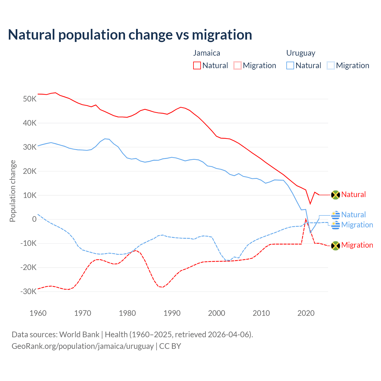 Over the last 10 years, 61.3% of the population change in Jamaica is from natural causes (a gain of 137,465 people) and 38.7% is from migration (a loss of 86,681 people). In Uruguay 70% is from natural causes (a gain of 64,303 people) and 30% is from migration (a loss of 27,501 people).