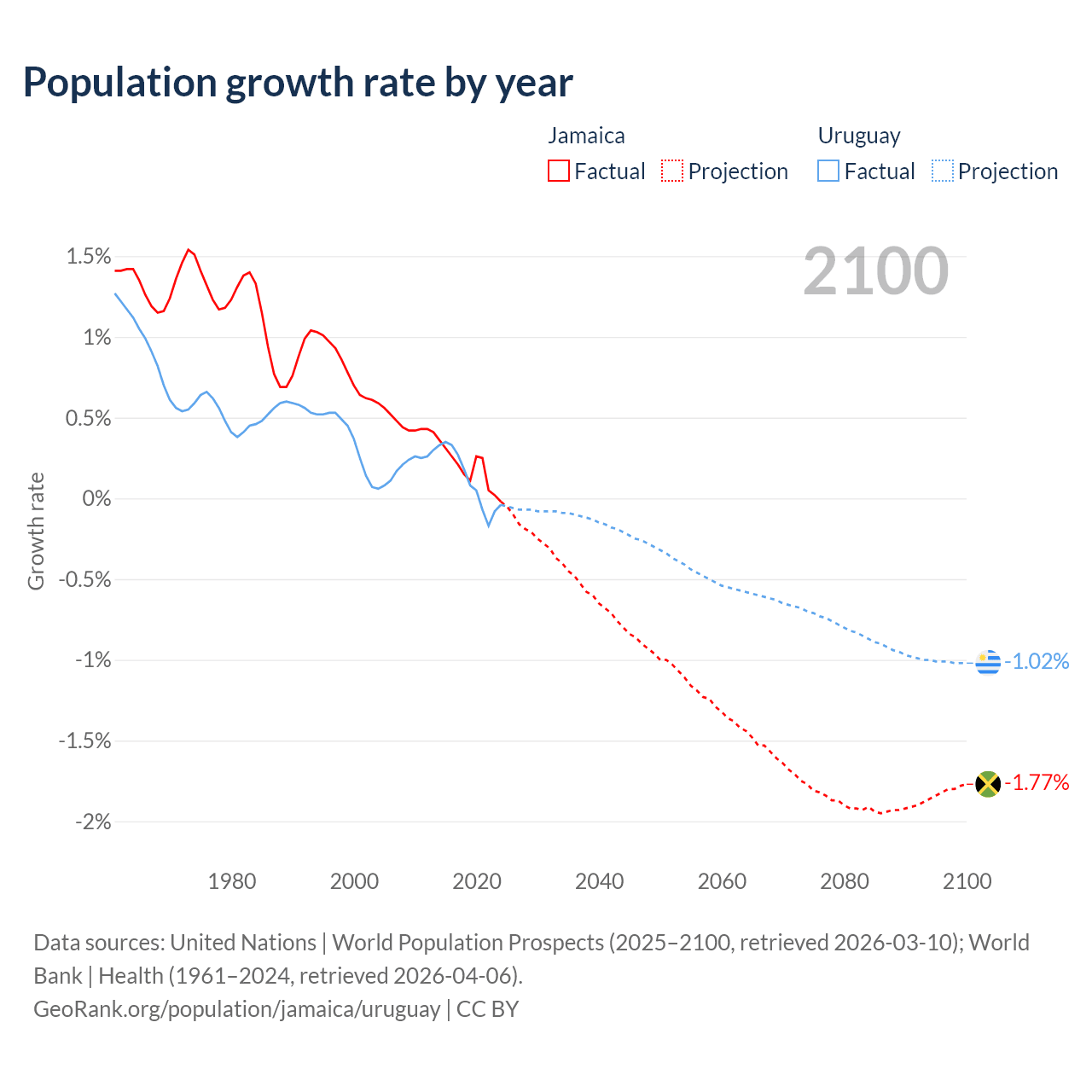 - For the last 10 years, Jamaica has had an average growth rate of +0.18% per year vs +0.11% in Uruguay.