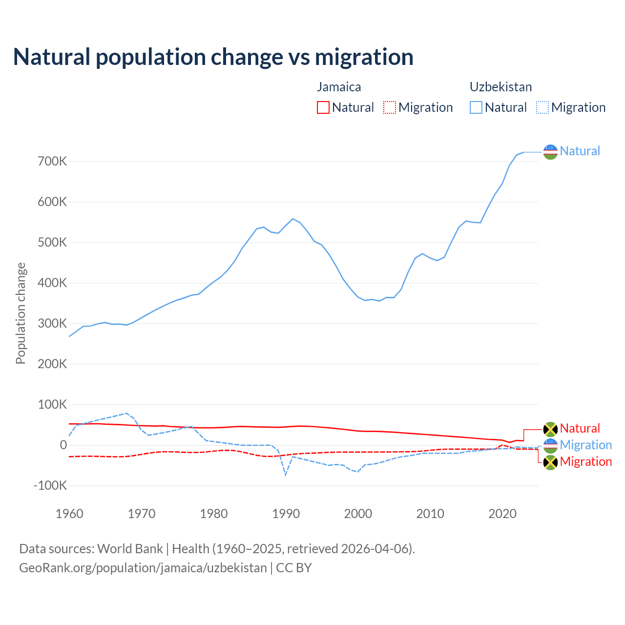 Over the last 10 years, 61.3% of the population change in Jamaica is from natural causes (a gain of 137,465 people) and 38.7% is from migration (a loss of 86,681 people). In Uzbekistan 98.2% is from natural causes (a gain of 6,161,117 people) and 1.84% is from migration (a loss of 115,398 people).