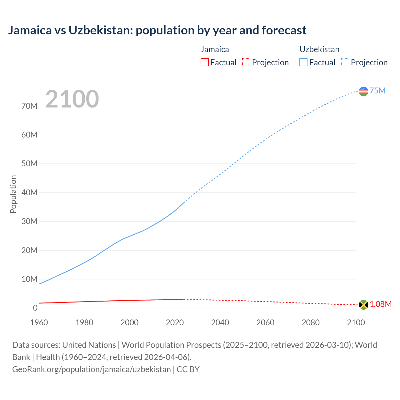 The latest officially reported population of Jamaica was 2,839,175 in 2024 vs 36,361,859 people in Uzbekistan in 2024. In 2026, based on the adjusted UN estimation, the current Jamaica's population is 2,834,980 people compared to 37,939,105 in Uzbekistan.