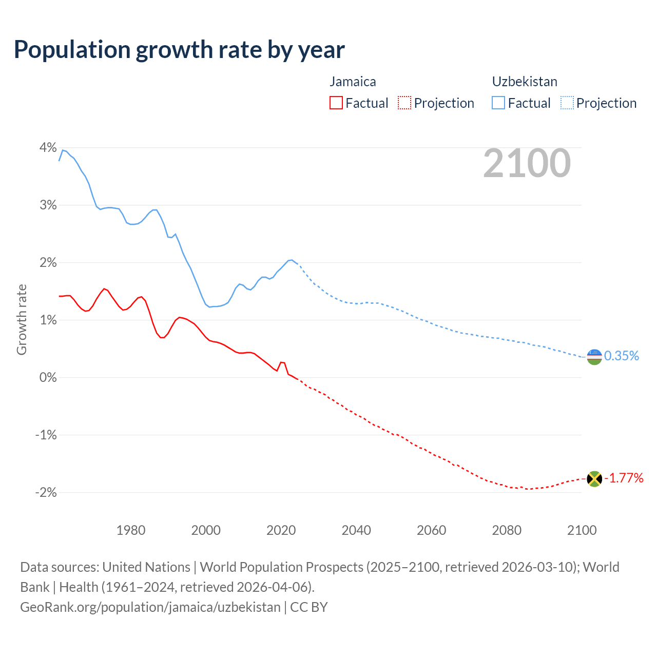 - For the last 10 years, Jamaica has had an average growth rate of +0.18% per year vs +1.85% in Uzbekistan.