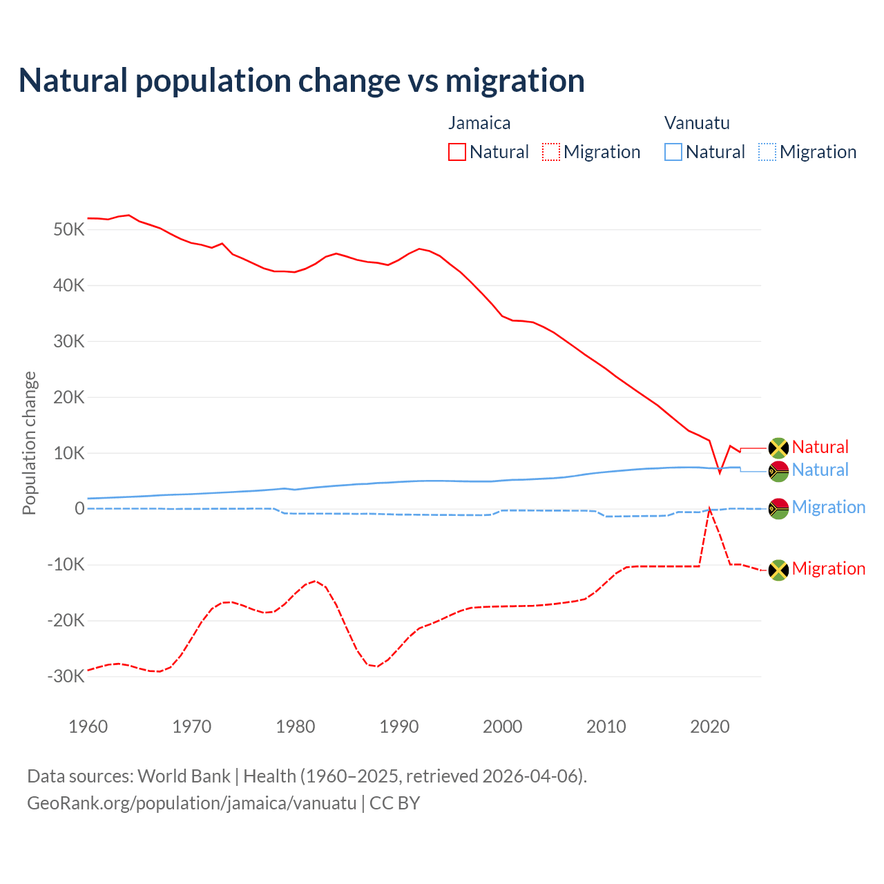 Over the last 10 years, 61.3% of the population change in Jamaica is from natural causes (a gain of 137,465 people) and 38.7% is from migration (a loss of 86,681 people). In Vanuatu 92.2% is from natural causes (a gain of 72,941 people) and 7.81% is from migration (a loss of 6,181 people).
