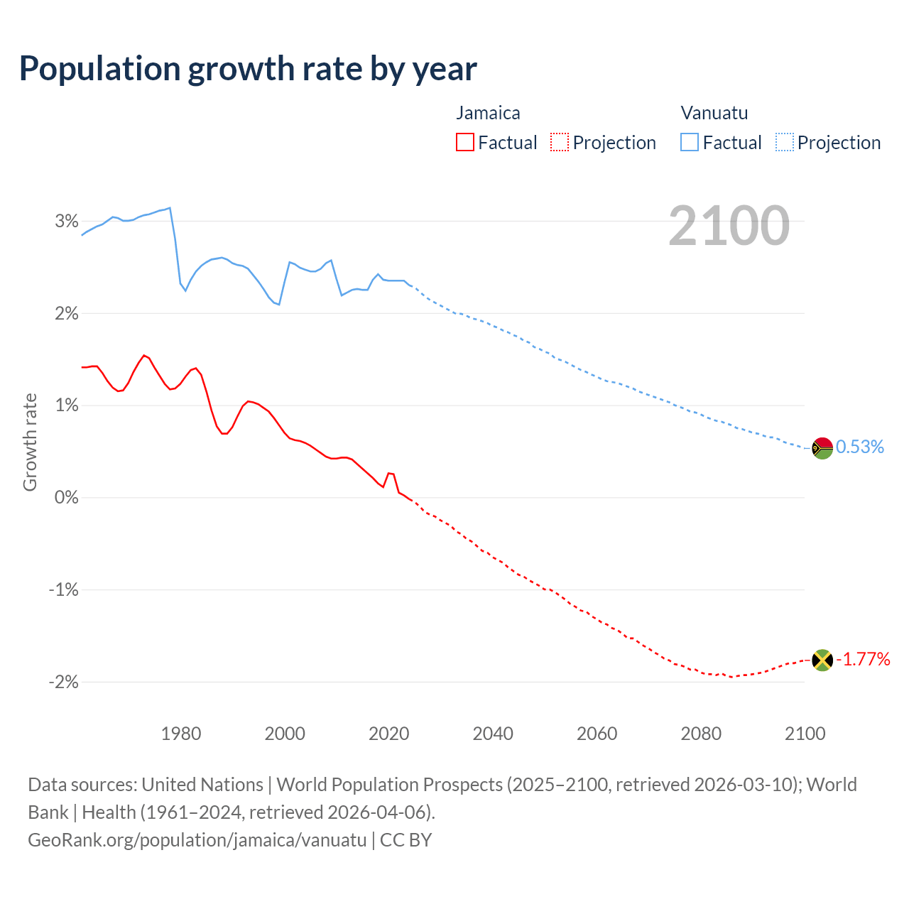 - For the last 10 years, Jamaica has had an average growth rate of +0.18% per year vs +2.33% in Vanuatu.