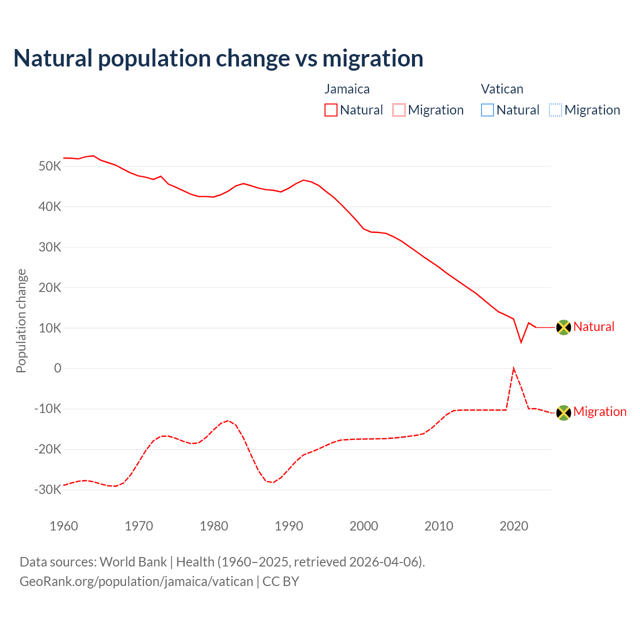 - For the last 10 years, Jamaica has had an average growth rate of +0.18% per year vs +1.9% in the Vatican.