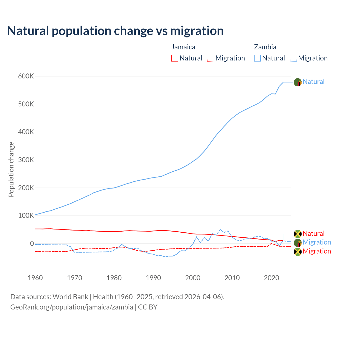 Over the last 10 years, 61.3% of the population change in Jamaica is from natural causes (a gain of 137,465 people) and 38.7% is from migration (a loss of 86,681 people). In Zambia 97.4% is from natural causes (a gain of 5,233,797 people) and 2.58% is from migration (a gain of 138,554 people).