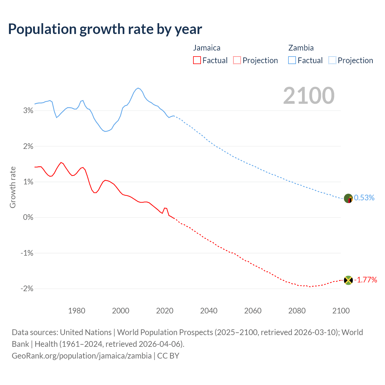 - For the last 10 years, Jamaica has had an average growth rate of +0.18% per year vs +3% in Zambia.