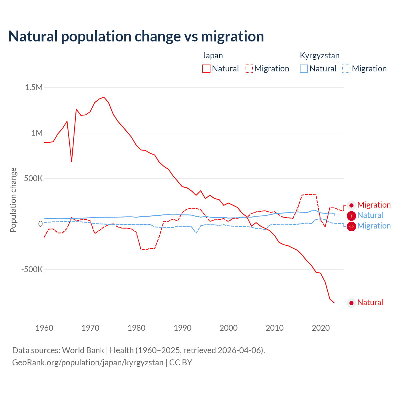 Over the last 10 years, 73.6% of the population change in Japan is from natural causes (a loss of 5,178,838 people) and 26.4% is from migration (a gain of 1,860,103 people). In Kyrgyzstan 88.5% is from natural causes (a gain of 1,258,837 people) and 11.5% is from migration (a gain of 164,132 people).