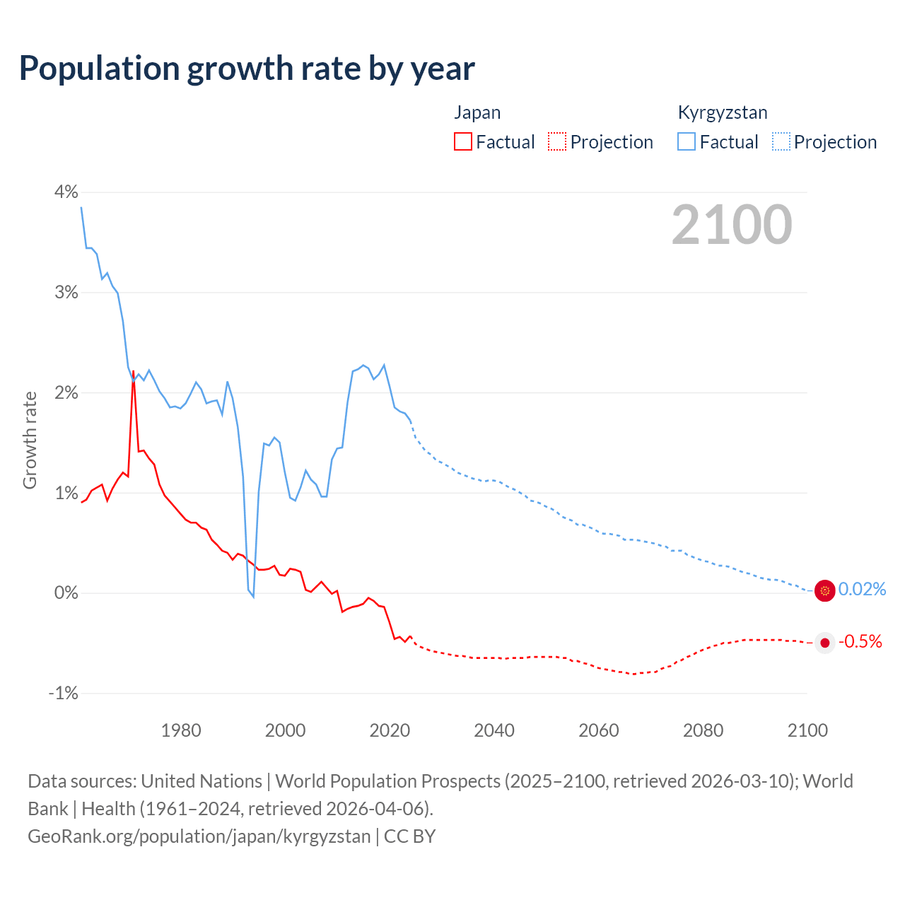 - For the last 10 years, Japan has had an average growth rate of -0.25% per year vs +2.05% in Kyrgyzstan.