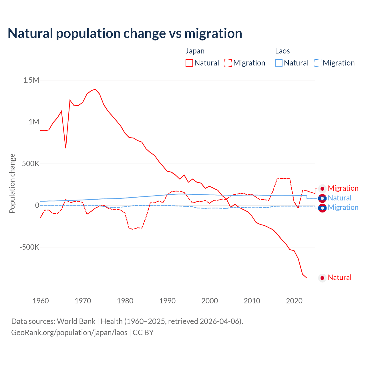 Over the last 10 years, 73.6% of the population change in Japan is from natural causes (a loss of 5,178,838 people) and 26.4% is from migration (a gain of 1,860,103 people). In Laos 90.6% is from natural causes (a gain of 1,183,013 people) and 9.41% is from migration (a loss of 122,899 people).