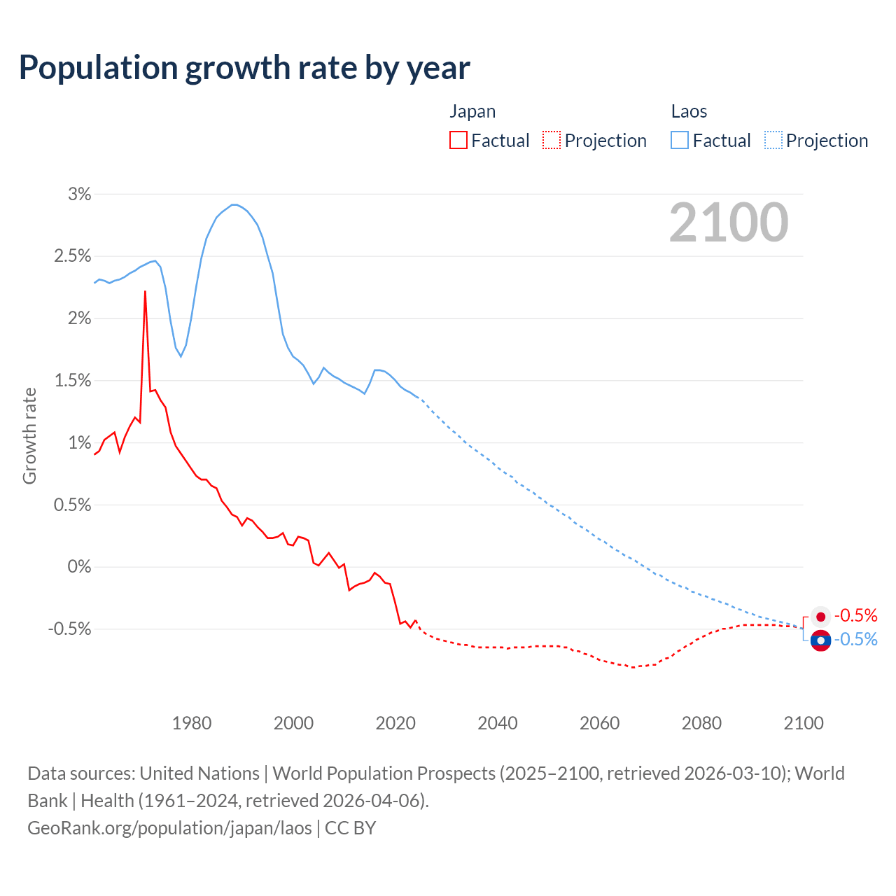 - For the last 10 years, Japan has had an average growth rate of -0.25% per year vs +1.48% in Laos.