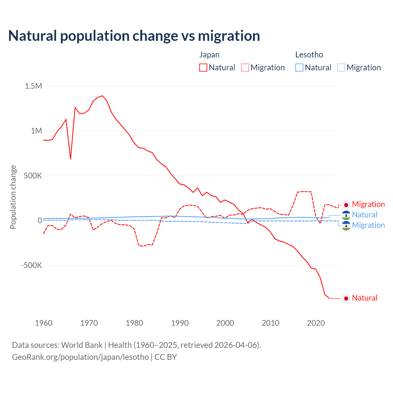Over the last 10 years, 73.6% of the population change in Japan is from natural causes (a loss of 5,178,838 people) and 26.4% is from migration (a gain of 1,860,103 people). In Lesotho 84.2% is from natural causes (a gain of 315,836 people) and 15.8% is from migration (a loss of 59,457 people).