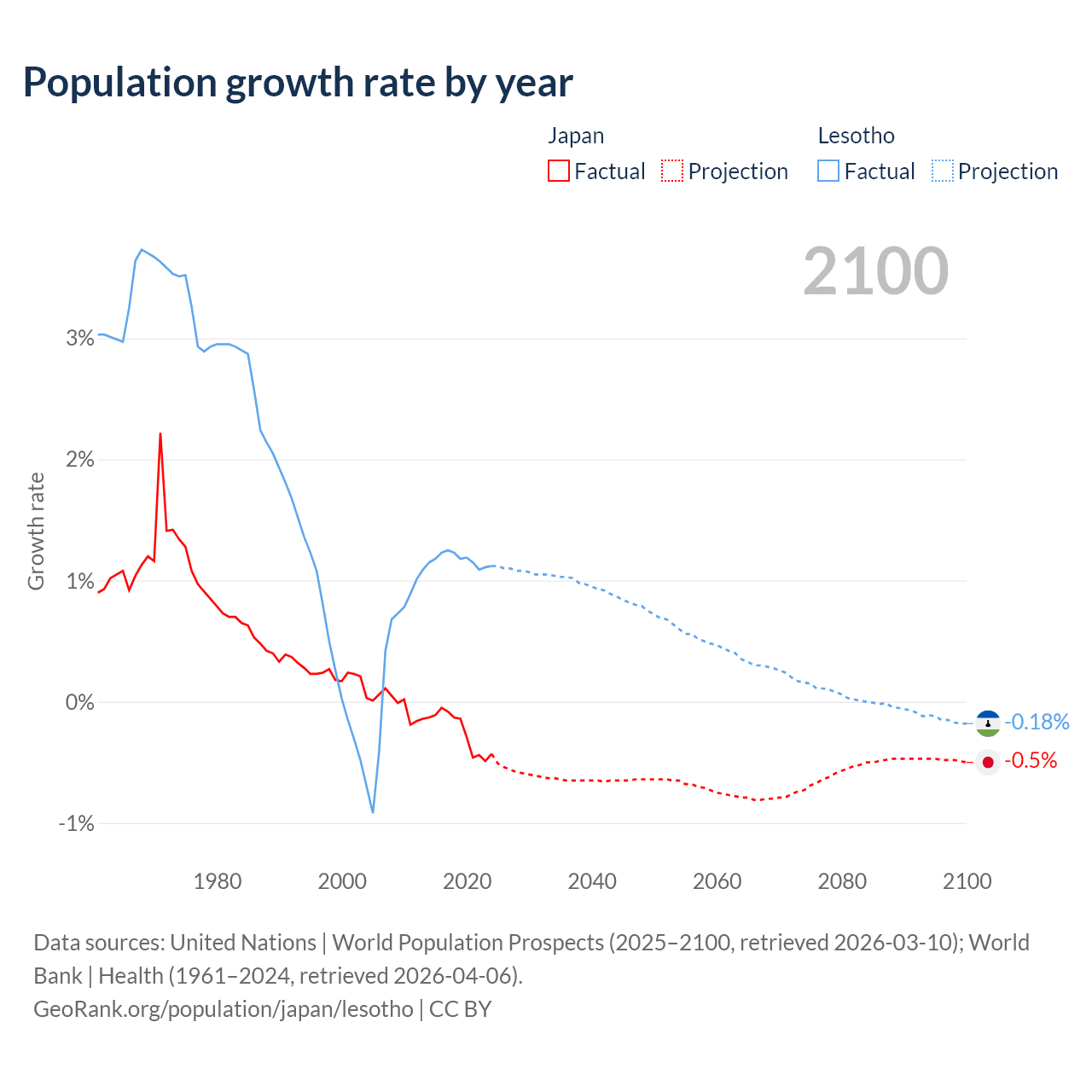 - For the last 10 years, Japan has had an average growth rate of -0.25% per year vs +1.17% in Lesotho.
