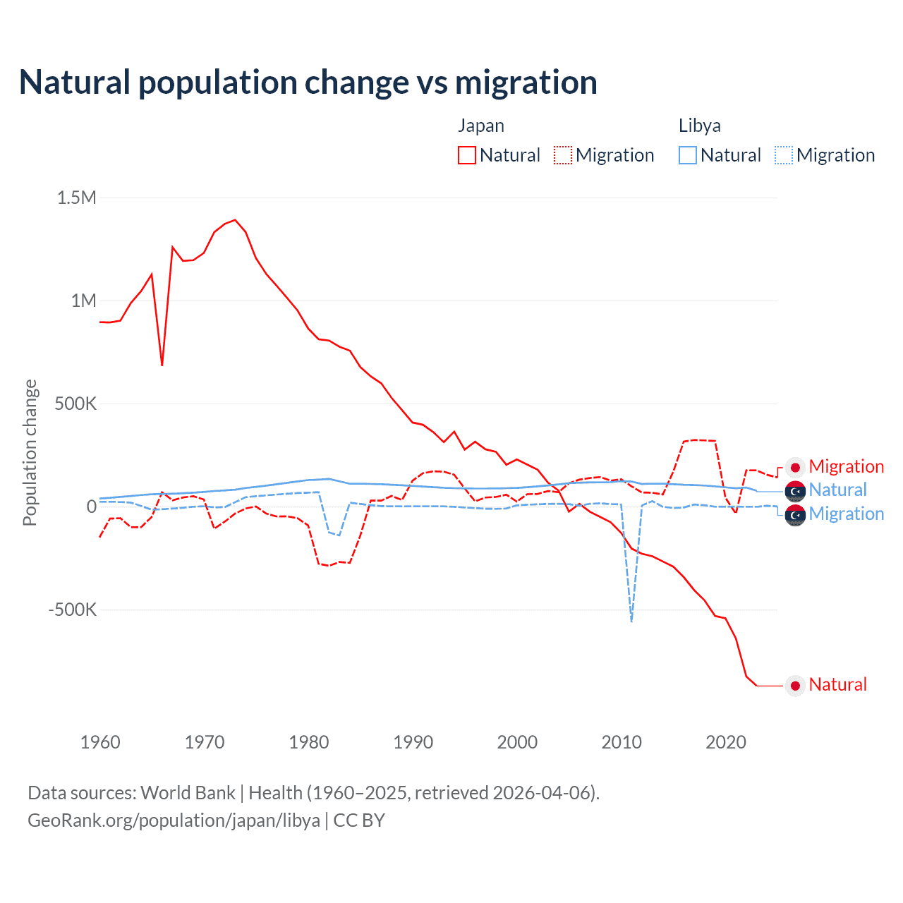 Over the last 10 years, 73.6% of the population change in Japan is from natural causes (a loss of 5,178,838 people) and 26.4% is from migration (a gain of 1,860,103 people). In Libya 99.4% is from natural causes (a gain of 975,799 people) and 0.63% is from migration (a loss of 6,150 people).