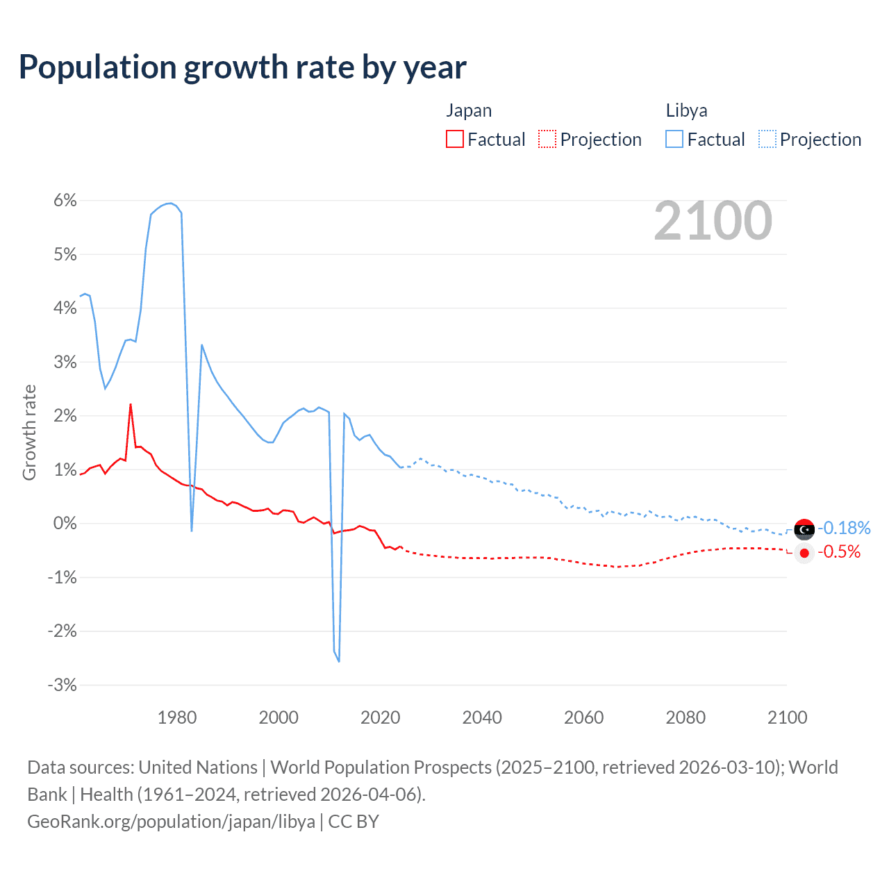 - For the last 10 years, Japan has had an average growth rate of -0.25% per year vs +1.44% in Libya.