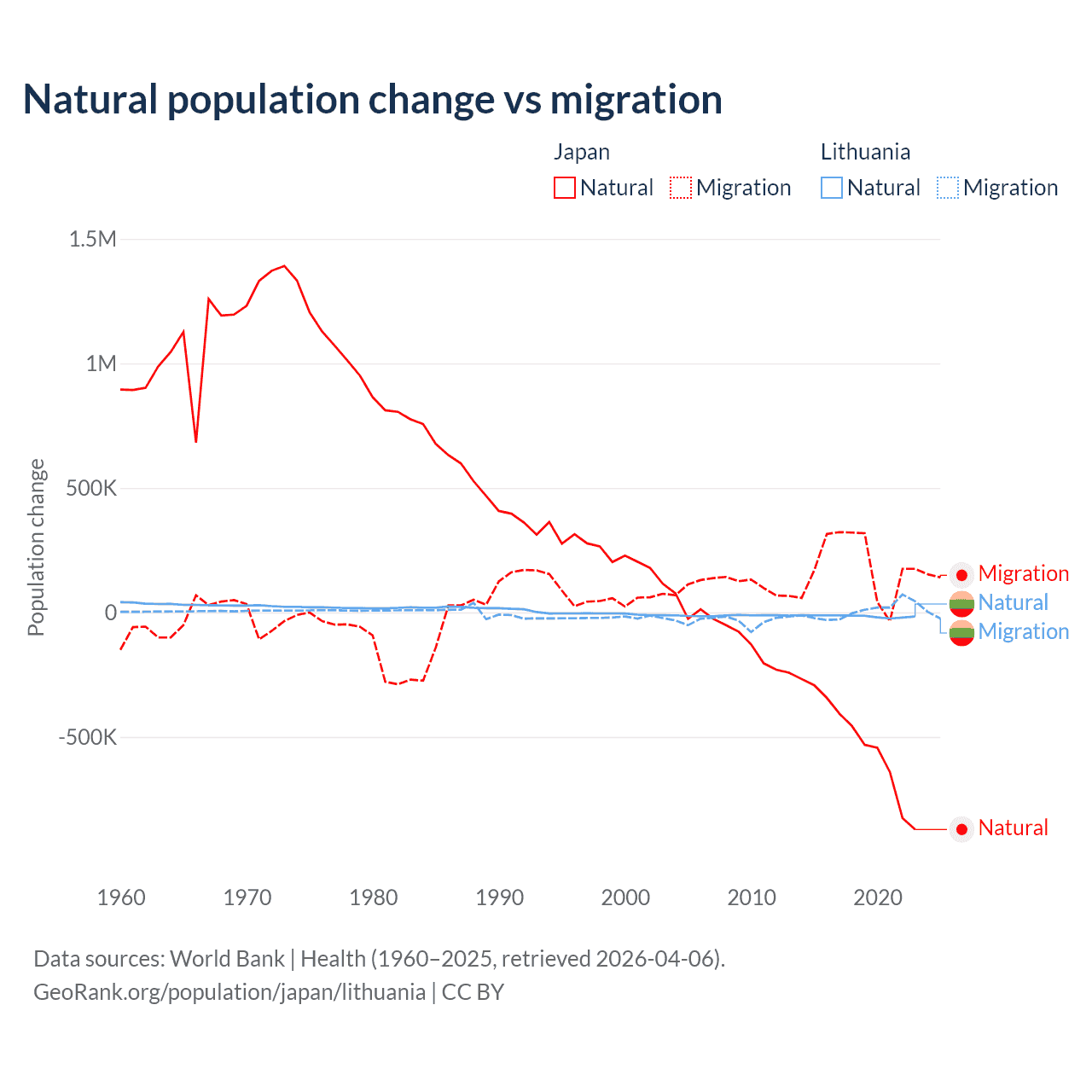 Over the last 10 years, 73.6% of the population change in Japan is from natural causes (a loss of 5,178,838 people) and 26.4% is from migration (a gain of 1,860,103 people). In Lithuania 68.7% is from natural causes (a loss of 153,859 people) and 31.3% is from migration (a gain of 70,196 people).