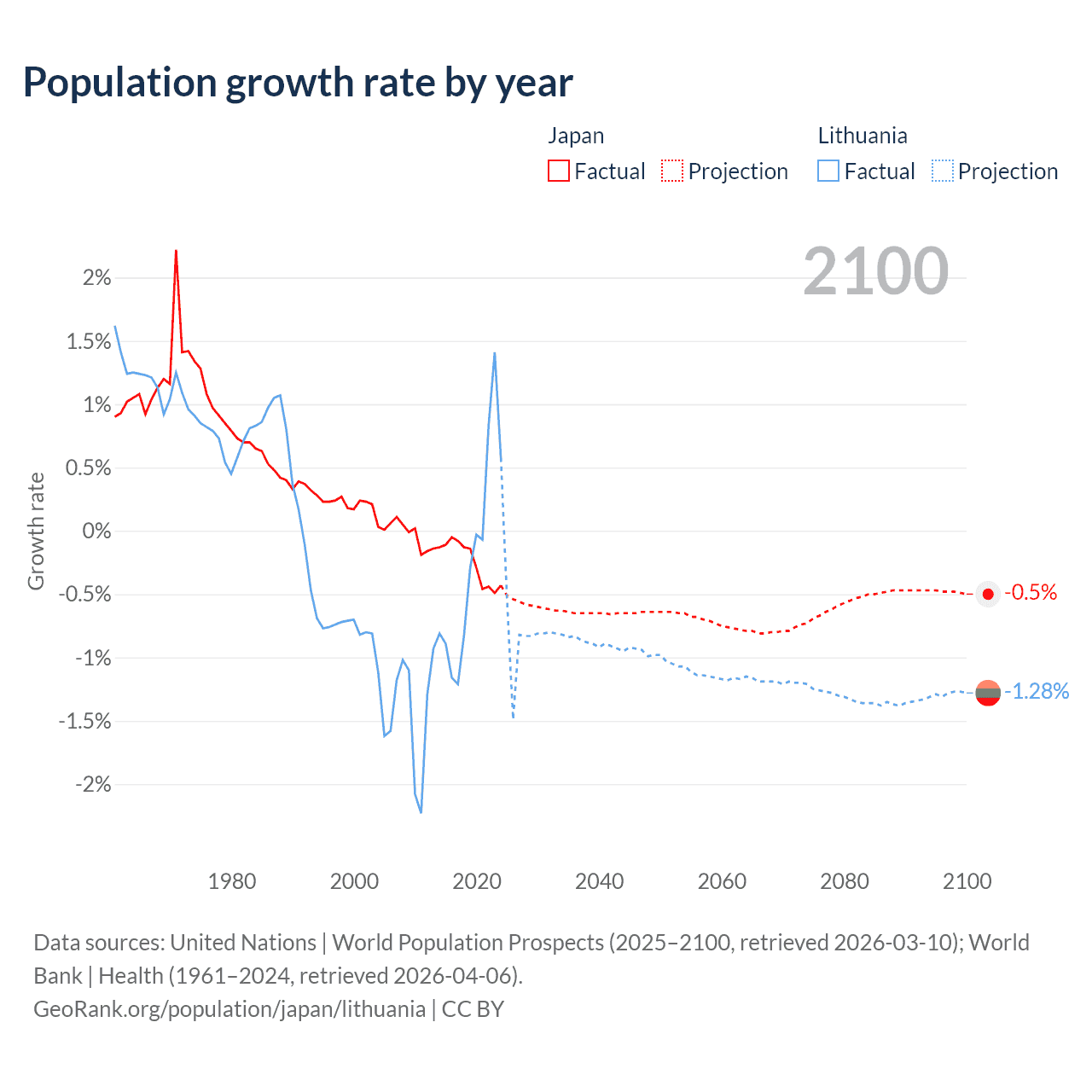 - For the last 10 years, Japan has had an average growth rate of -0.25% per year vs -0.22% in Lithuania.