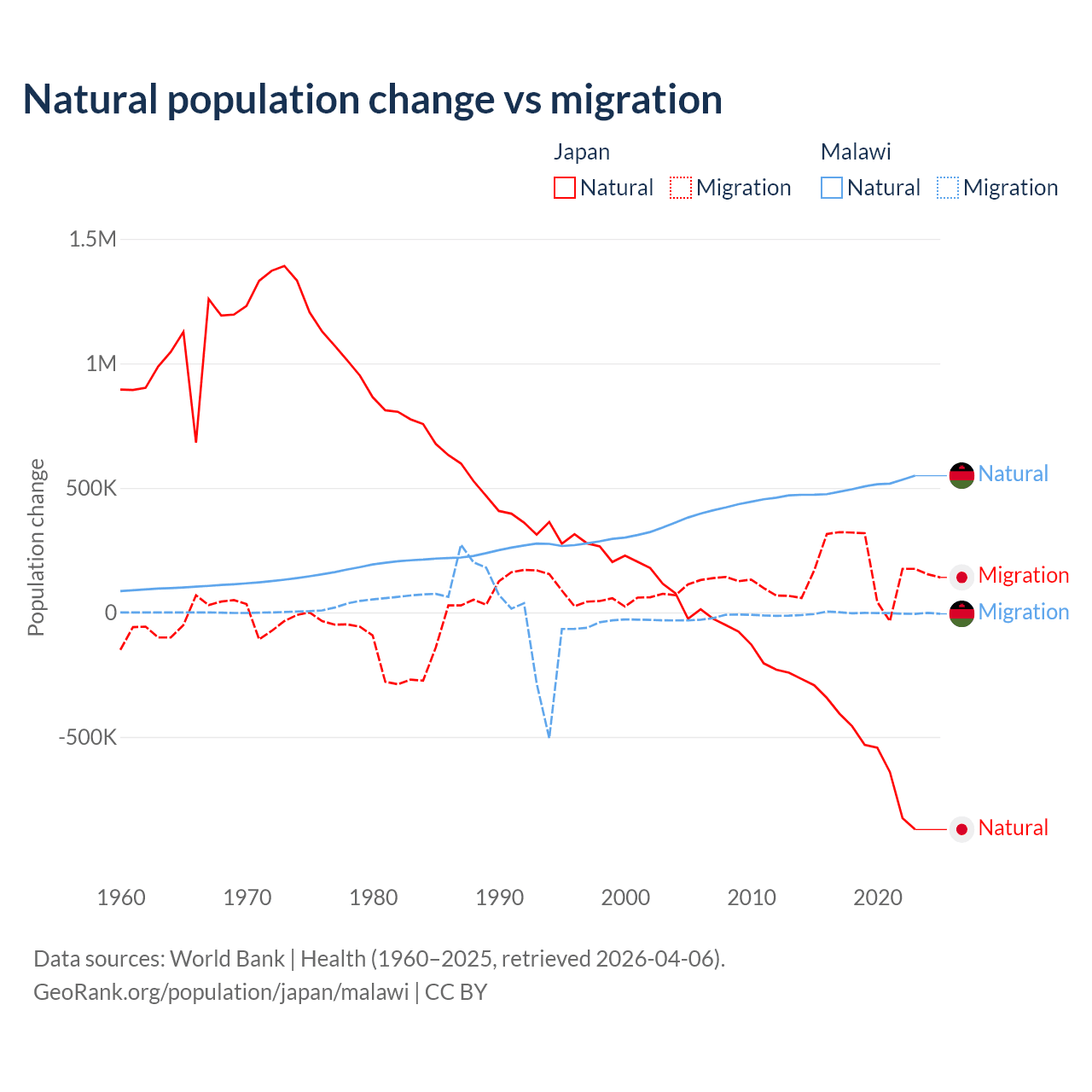 Over the last 10 years, 73.6% of the population change in Japan is from natural causes (a loss of 5,178,838 people) and 26.4% is from migration (a gain of 1,860,103 people). In Malawi 99.3% is from natural causes (a gain of 5,019,393 people) and 0.67% is from migration (a loss of 33,768 people).
