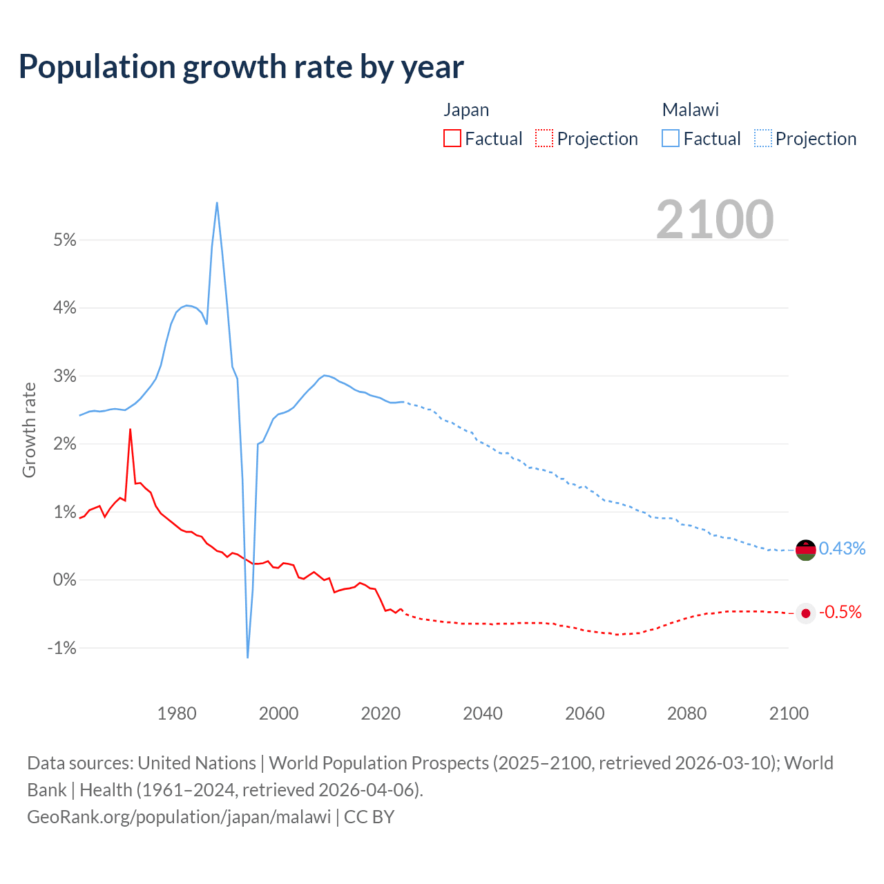 - For the last 10 years, Japan has had an average growth rate of -0.25% per year vs +2.7% in Malawi.