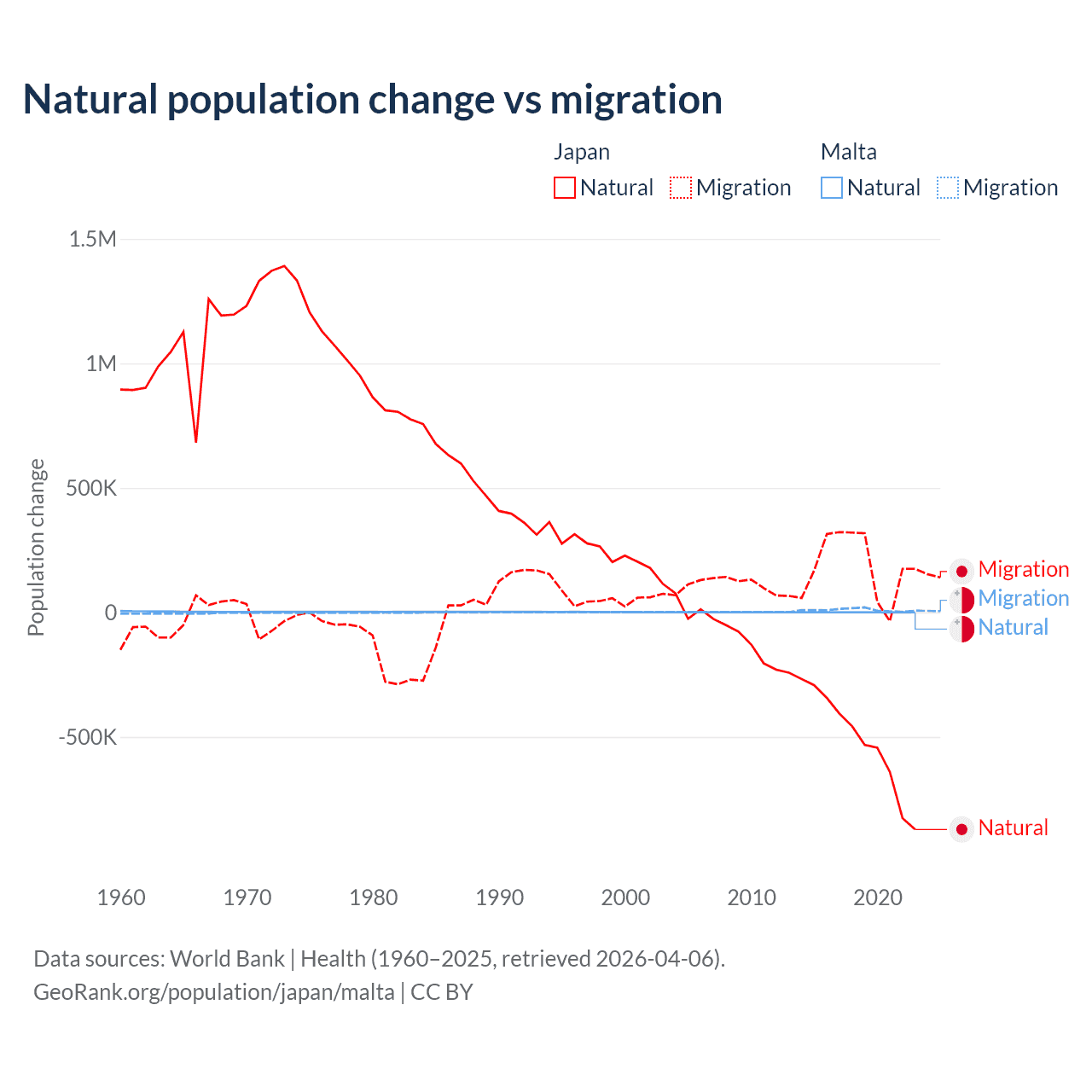 Over the last 10 years, 73.6% of the population change in Japan is from natural causes (a loss of 5,178,838 people) and 26.4% is from migration (a gain of 1,860,103 people). In Malta 5.84% is from natural causes (a gain of 6,181 people) and 94.2% is from migration (a gain of 99,652 people).
