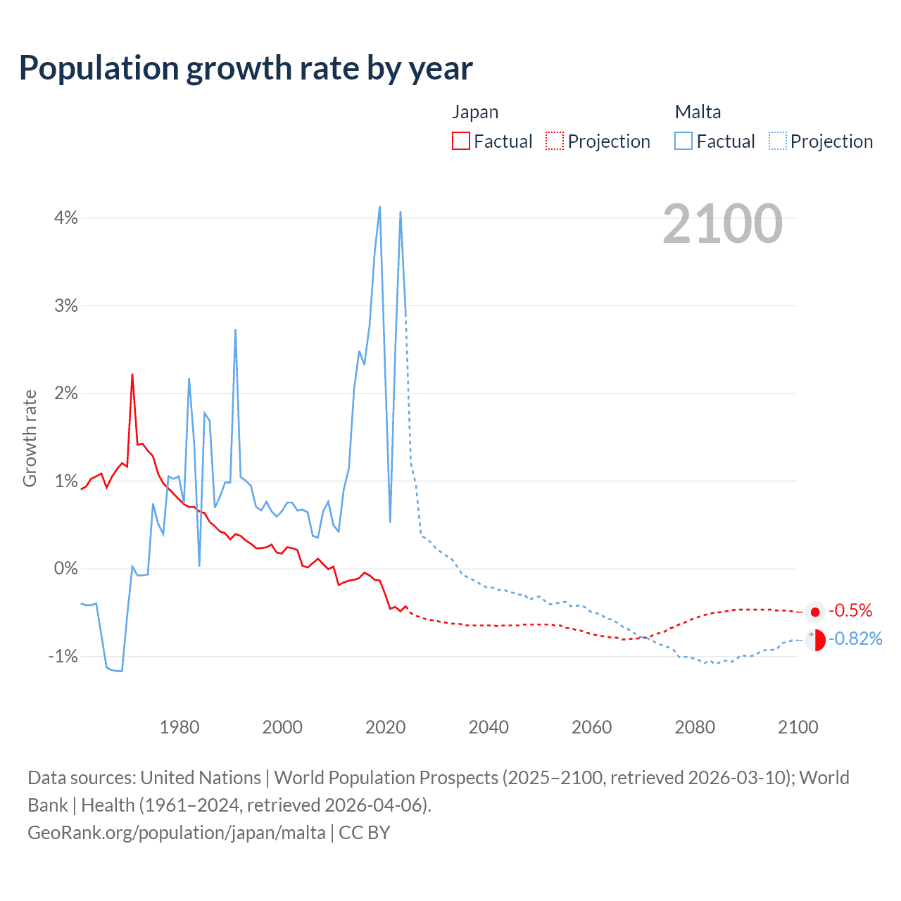 - For the last 10 years, Japan has had an average growth rate of -0.25% per year vs +2.69% in Malta.