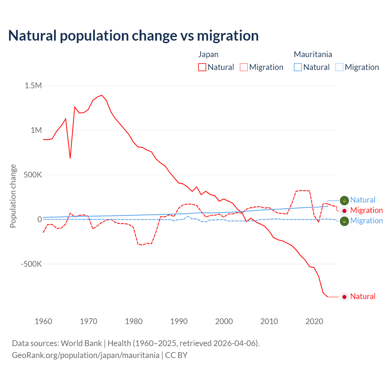 Over the last 10 years, 73.6% of the population change in Japan is from natural causes (a loss of 5,178,838 people) and 26.4% is from migration (a gain of 1,860,103 people). In Mauritania 98.9% is from natural causes (a gain of 1,320,903 people) and 1.12% is from migration (a loss of 14,982 people).