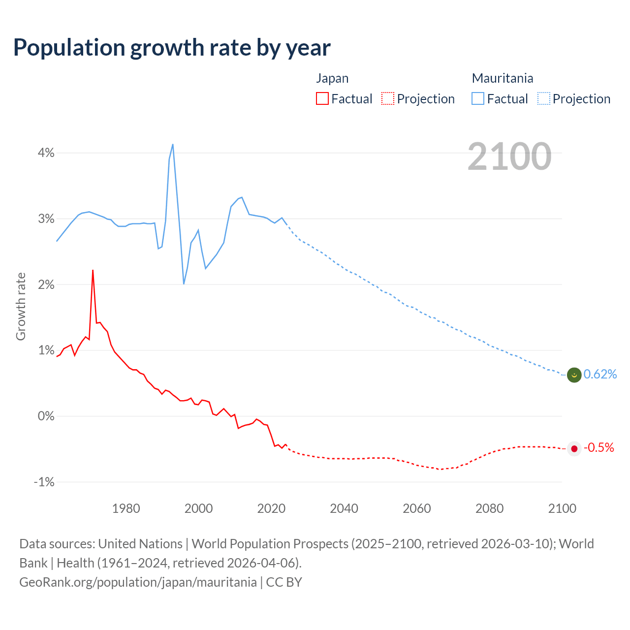 - For the last 10 years, Japan has had an average growth rate of -0.25% per year vs +3% in Mauritania.
