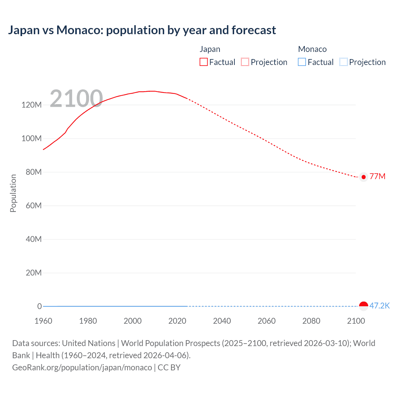 Japan vs Monaco: population by year and forecast