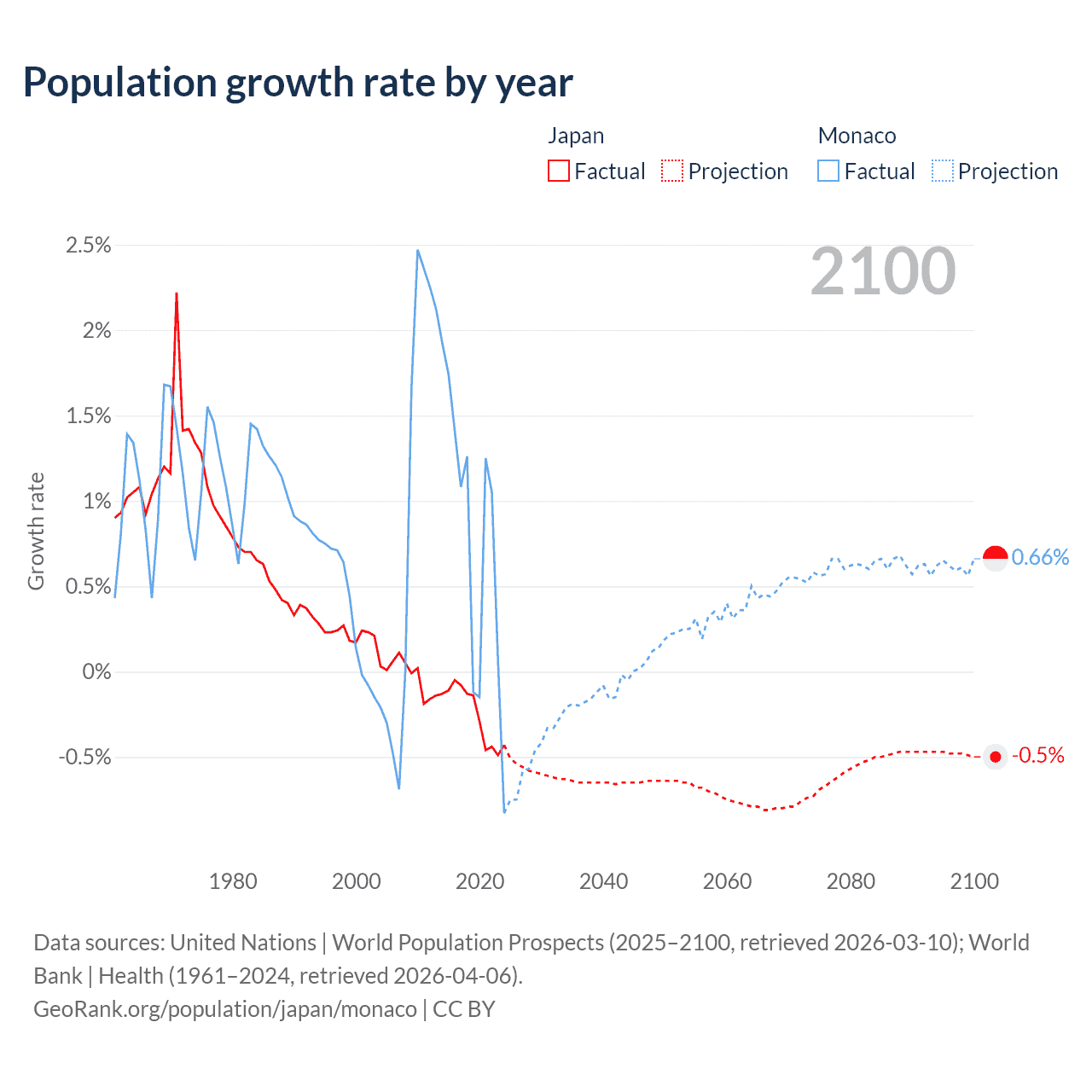- For the last 10 years, Japan has had an average growth rate of -0.25% per year vs +0.79% in Monaco.