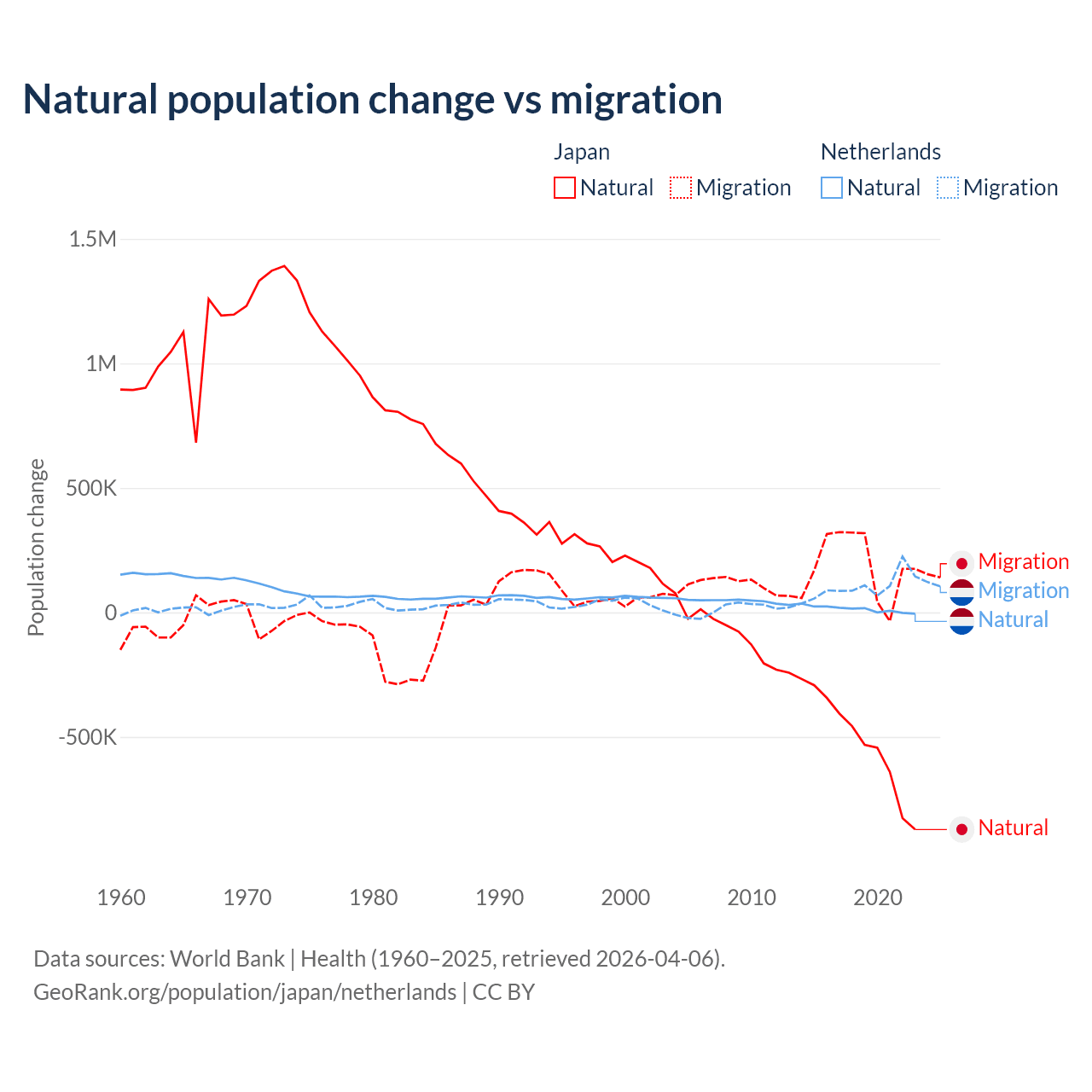 Over the last 10 years, 73.6% of the population change in Japan is from natural causes (a loss of 5,178,838 people) and 26.4% is from migration (a gain of 1,860,103 people). In the Netherlands 11.8% is from natural causes (a gain of 134,554 people) and 88.2% is from migration (a gain of 1,006,495 people).