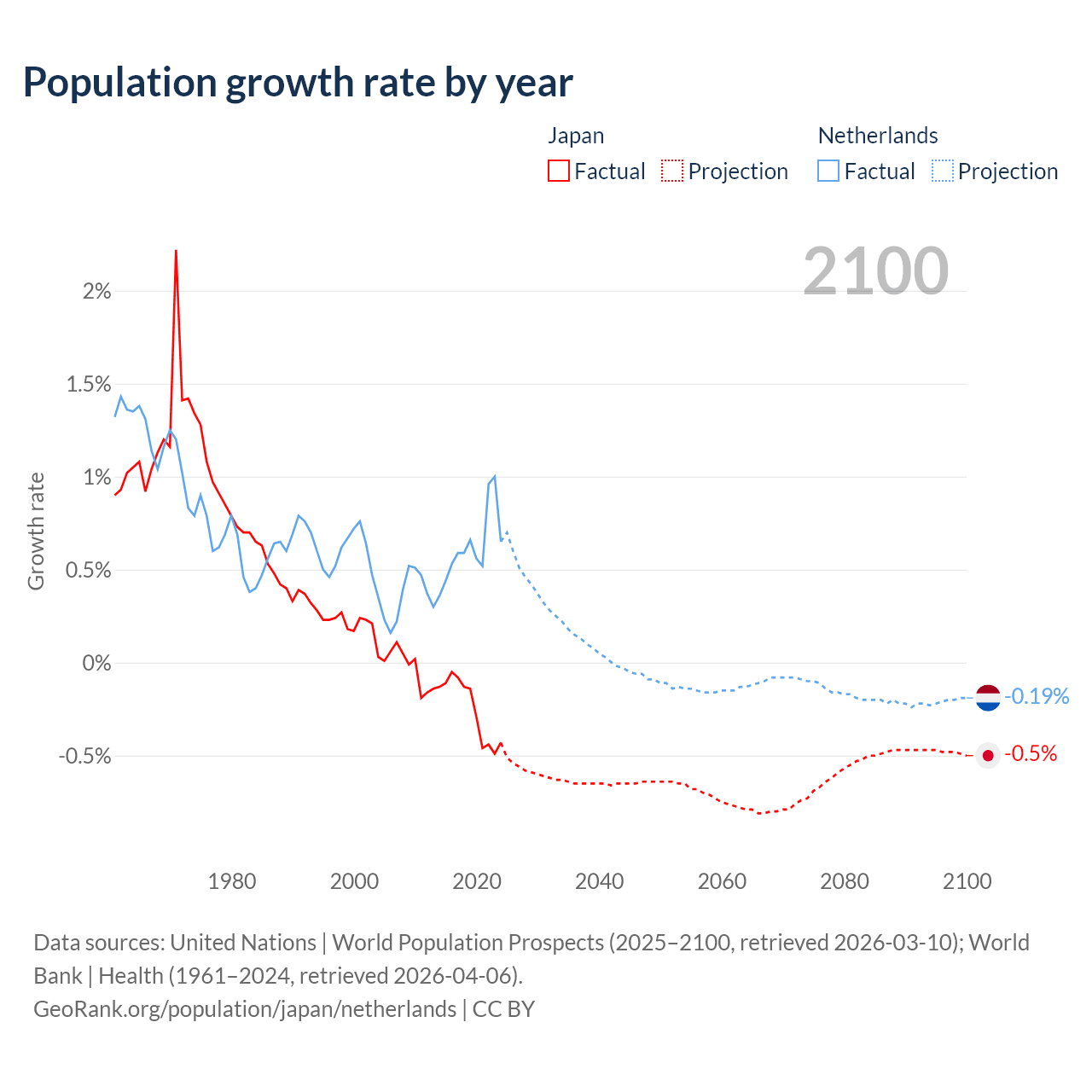 - For the last 10 years, Japan has had an average growth rate of -0.25% per year vs +0.62% in the Netherlands.