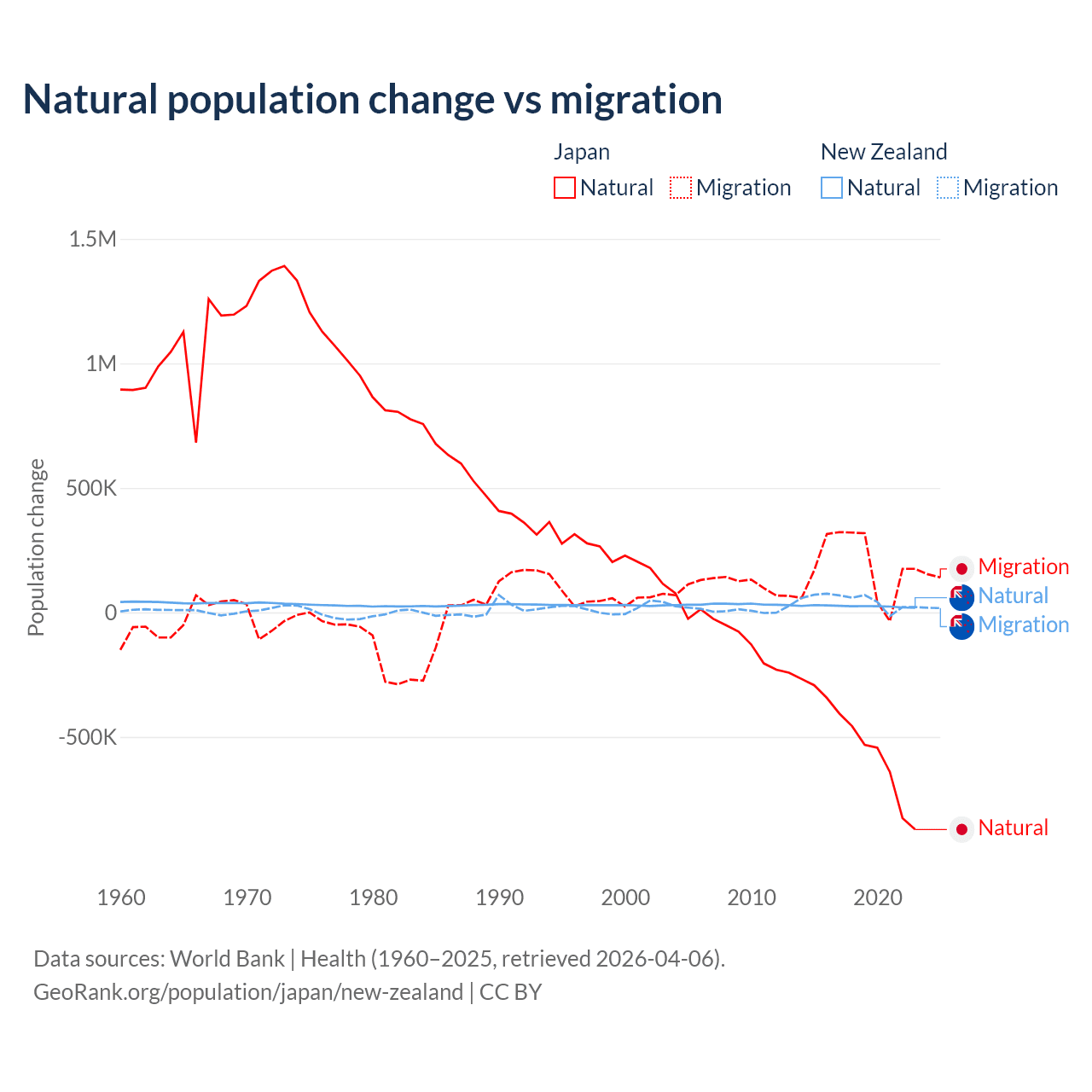Over the last 10 years, 73.6% of the population change in Japan is from natural causes (a loss of 5,178,838 people) and 26.4% is from migration (a gain of 1,860,103 people). In New Zealand 34.4% is from natural causes (a gain of 247,767 people) and 65.6% is from migration (a gain of 471,602 people).