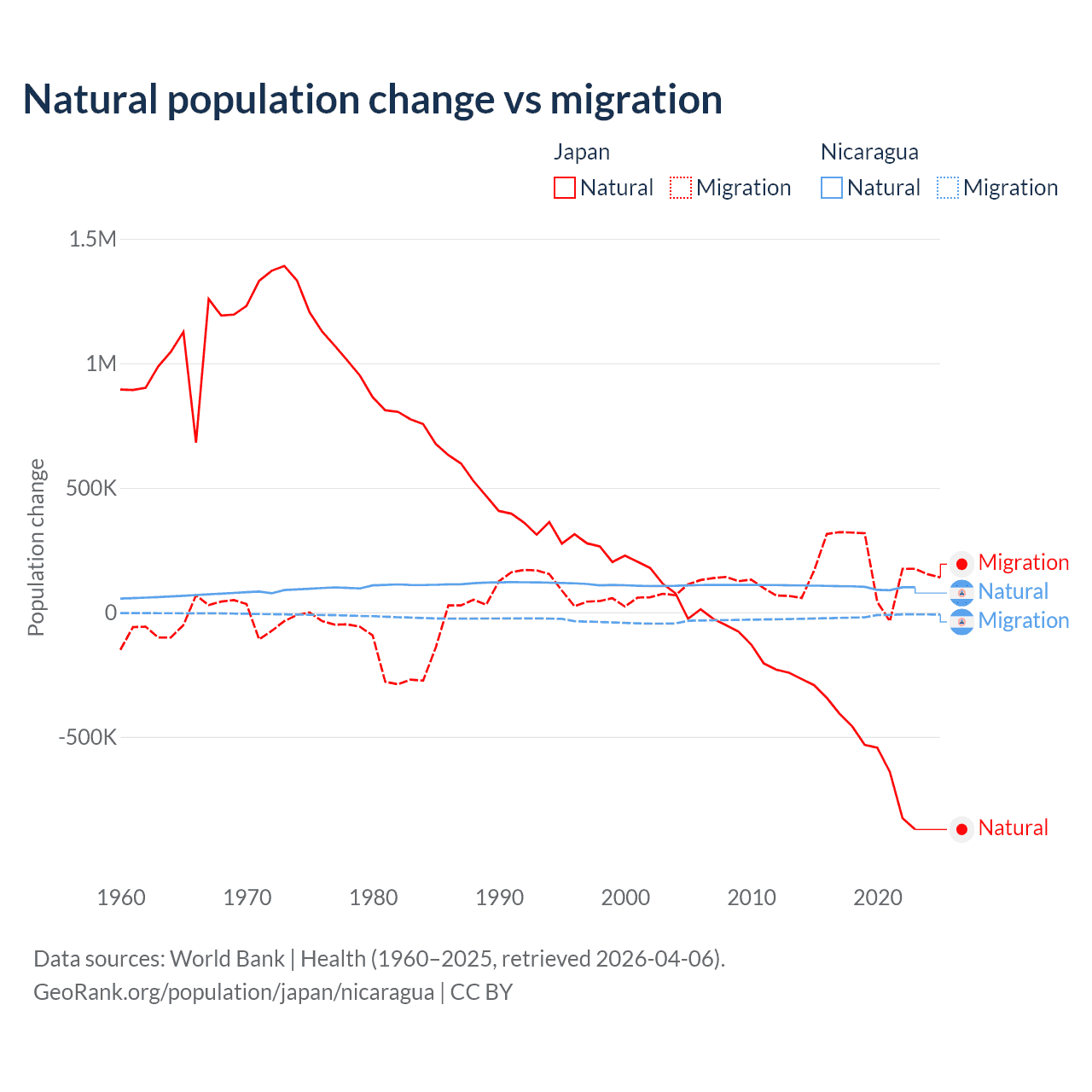 Over the last 10 years, 73.6% of the population change in Japan is from natural causes (a loss of 5,178,838 people) and 26.4% is from migration (a gain of 1,860,103 people). In Nicaragua 85.5% is from natural causes (a gain of 1,017,084 people) and 14.5% is from migration (a loss of 172,078 people).