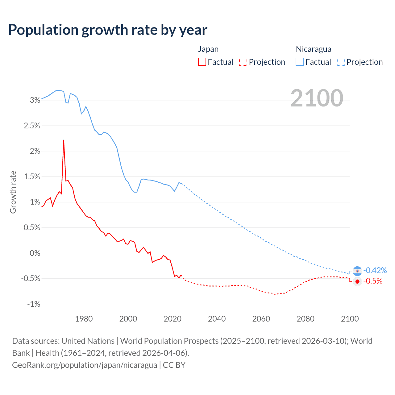 - For the last 10 years, Japan has had an average growth rate of -0.25% per year vs +1.33% in Nicaragua.
