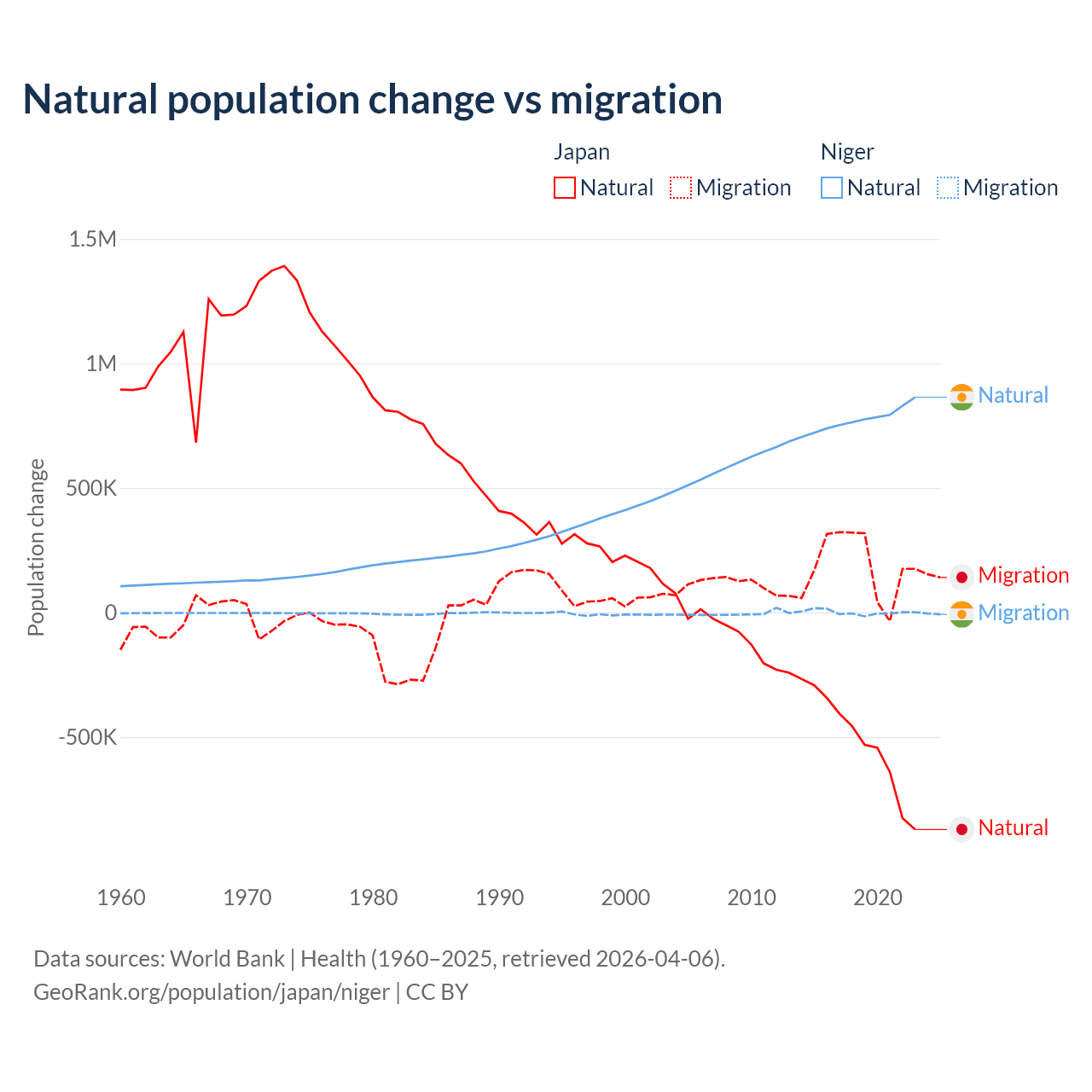 Over the last 10 years, 73.6% of the population change in Japan is from natural causes (a loss of 5,178,838 people) and 26.4% is from migration (a gain of 1,860,103 people). In Niger 100% is from natural causes (a gain of 7,728,287 people) and 0.03% is from migration (a gain of 2,520 people).